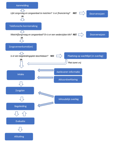 (De start van) het begeleidingstraject bestaat uit verschillende stappen. Hieronder zijn alle stappen schematisch weergegeven. Vervolgens wordt elke stap uitgelegd.